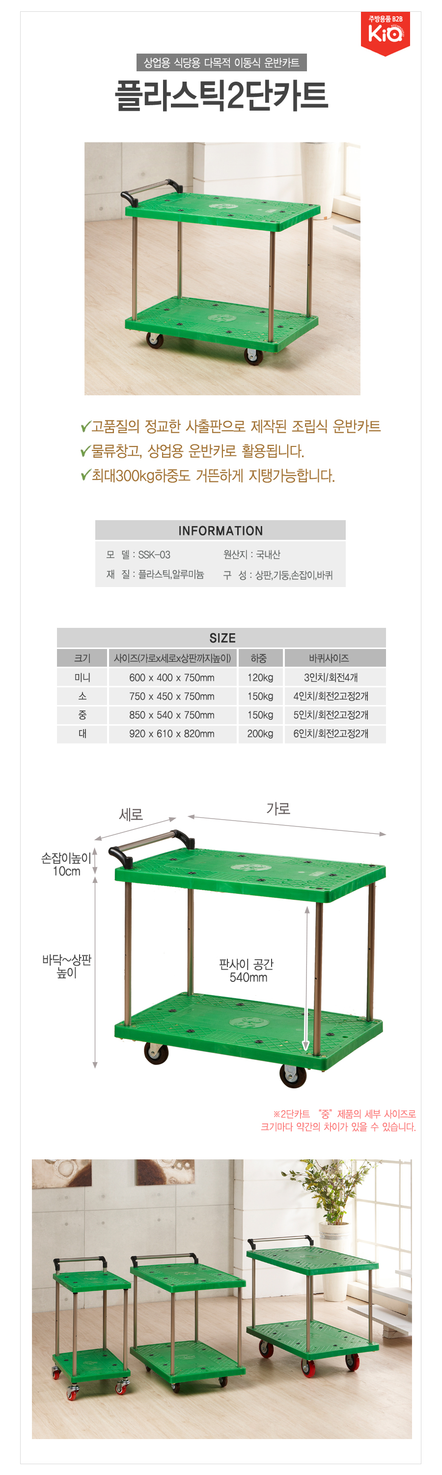 국산 플라스틱 2단 서빙 카트 식당 운반 웨건 미니 파랑