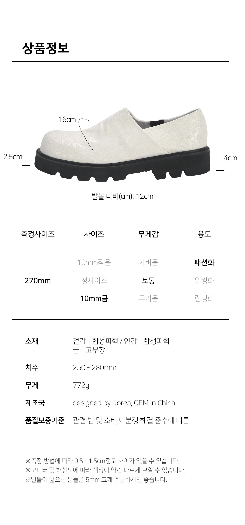 | 색상 | 블랙, 화이트 | 발길이 | 255-275mm(단위:10mm) |