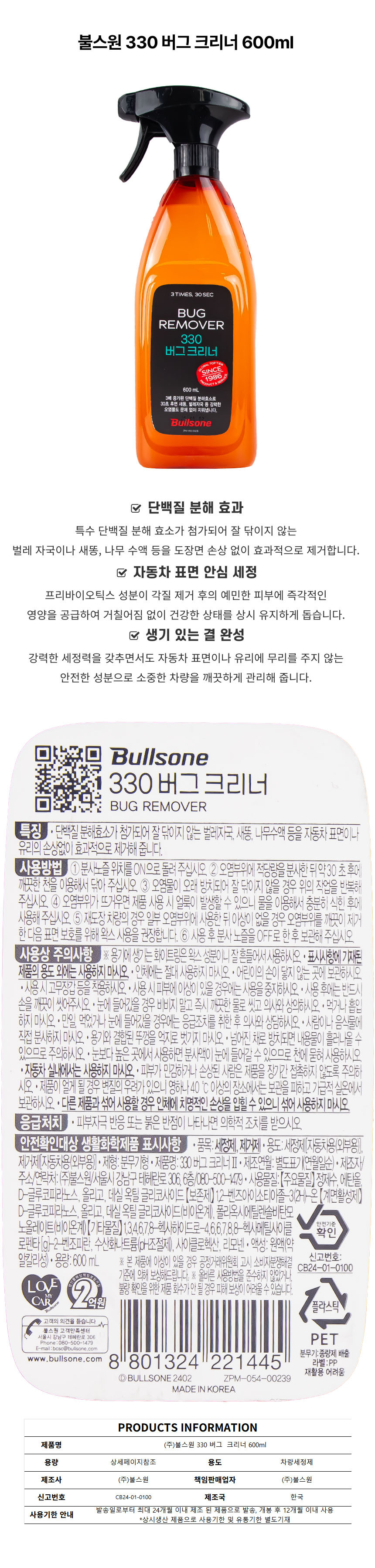 불스원 330 버그  크리너 600ml