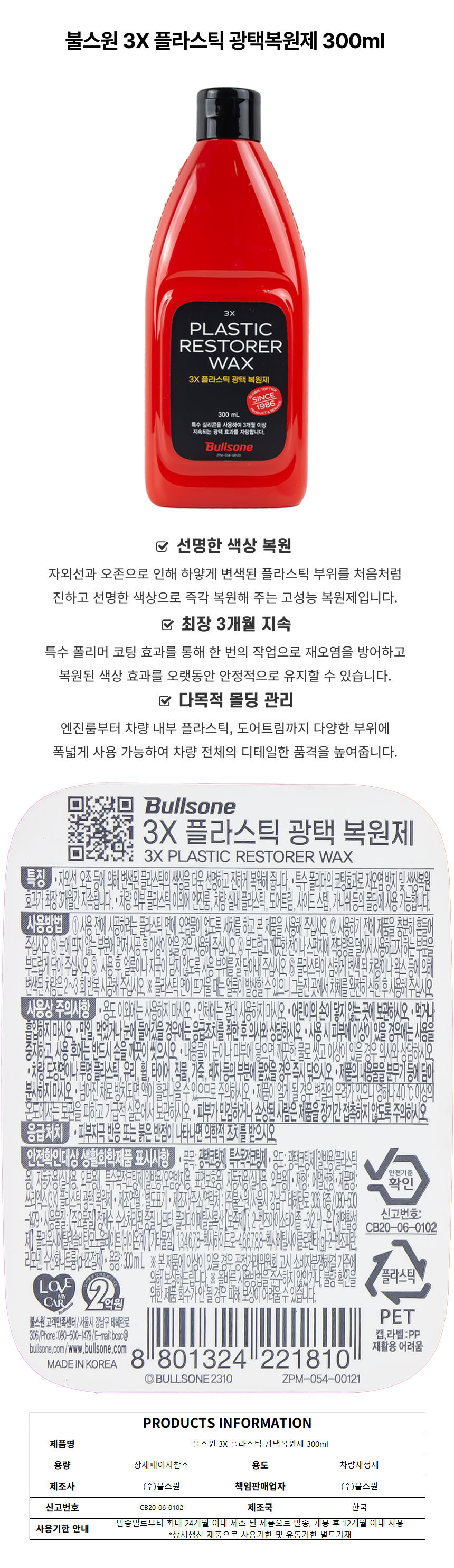 불스원 3X 플라스틱 광택복원제 300ml
