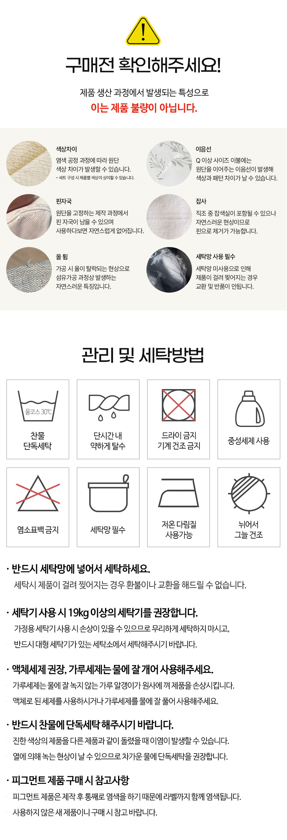 | 세탁방법 및 취급시 주의사항 | 세탁방법:상세설명참조 / 취급시 주의사항:상세설명참조 | 품질보증기준 | 품질보증기준:상세설명참조 |