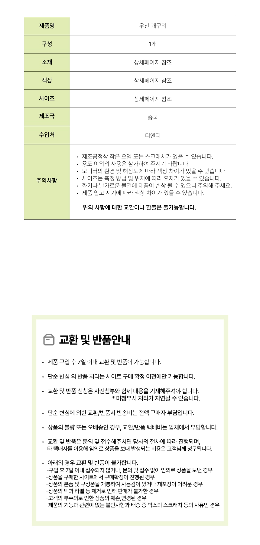 | 상품의 교환/반품/보증 조건 및 품질보증 기준 | |||
