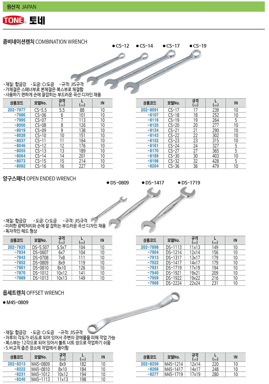 재질 : 합금강 도금 : Cr도금 규격 : JIS규격 가체결은 스패너부로 본체결은 복스부로 체결함 사용하기 편하게 손에 잘잡히는 부드러운 곡선 디자인 채용