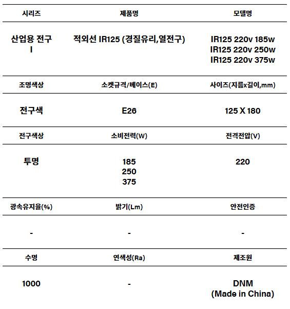 | 품명 및 모델명 | 적외선 IR125(경질유리,열전구)/185W 220V E26 |