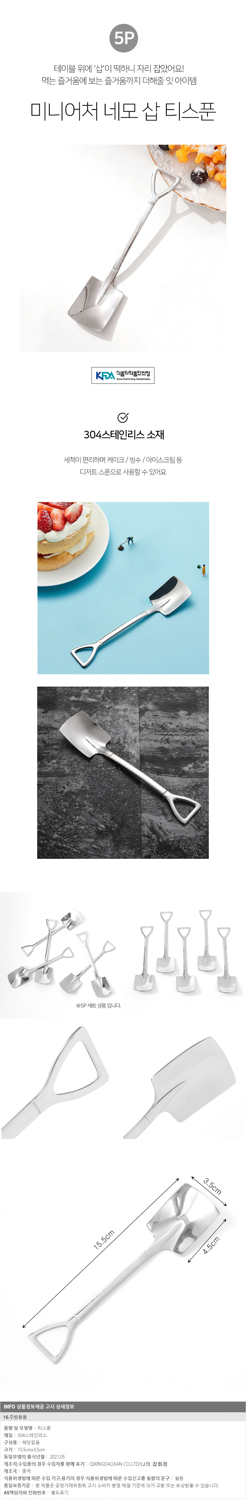 | 제품군 | 기타재화 | 품명 | 7day 네모 삽모양 티스푼 5p 선물세트 스텐 숟가락 |