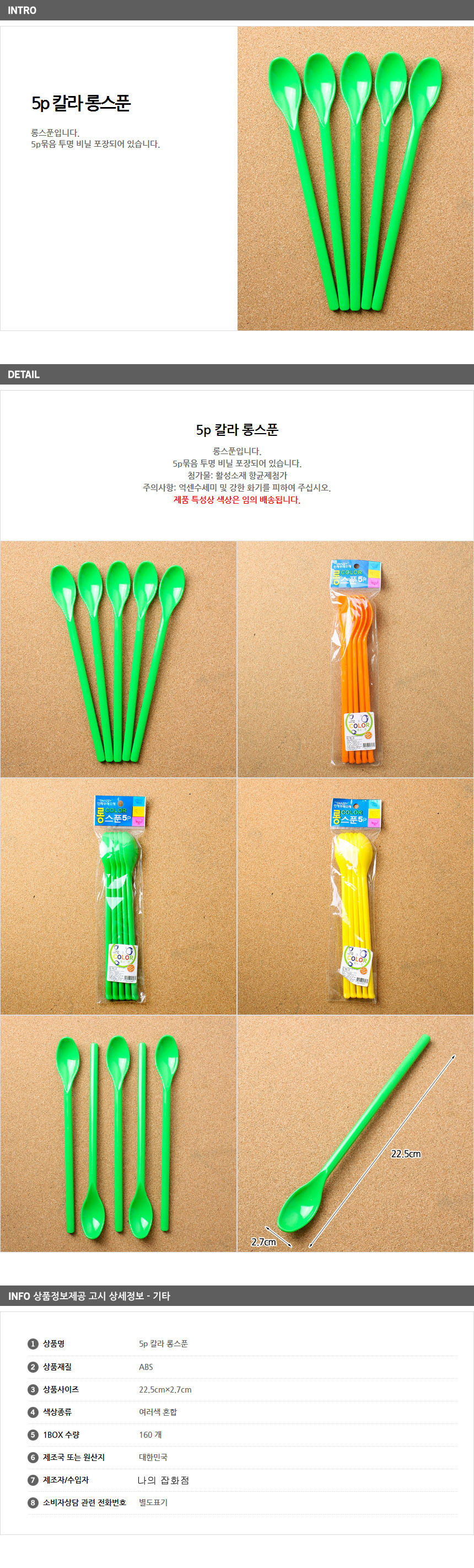 | 제품군 | 기타재화 | 품명 | 7day 5p세트 플라스틱 롱스푼(초록,노랑,오렌지랜덤) |